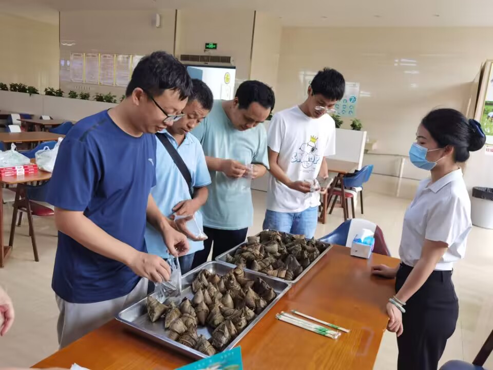 活动不仅提供香粽品尝,教职工还可以体验包粽子。活动现场,工作人员早早就准备好了糯米、粽叶等食材,绳子、剪刀等工具。活动过程中,大家在包粽“能手”的指导下,手持粽叶、填料压实、封口扎捆,有条不紊的包着粽子。经过大家的精心制作,各式各样、独具风格的粽子摆满了桌面。大家边包粽子,边交流包粽子的经验,讲述端午风俗,现场欢声笑语,洋溢着浓厚的节日气氛。