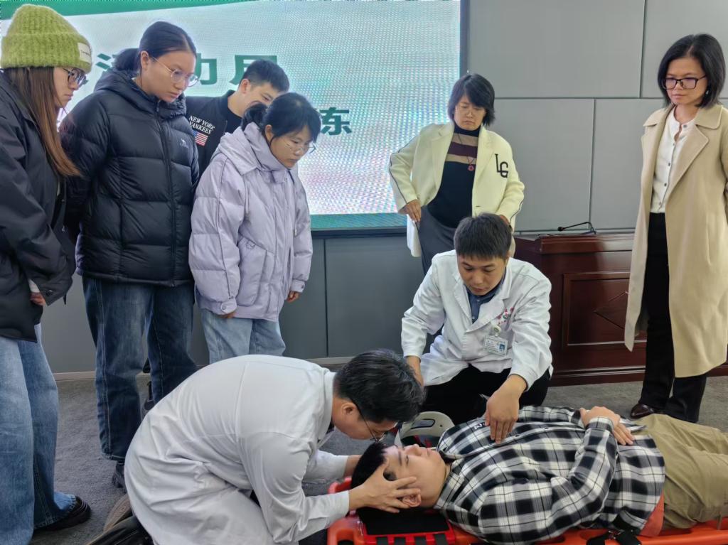 本次活动邀请了第二附属医院急诊科副主任医师张杰一行开展讲座和培训。“止血包扎搬运固定及实战演练”详细讲述了常见的出血类型、止血方法、包扎技巧、搬运原则以及固定方法等方面知识。讲座结束后,在医护人员的指导下,师生们进行了止血包扎、搬运固定等实战操作。