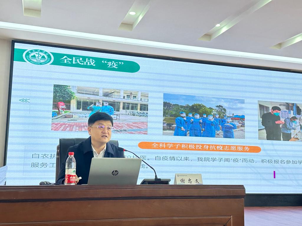 在两个小时的时间里,谢忠文介绍了在疫情三年里,全国人民在党中央的正确领导下,付出了巨大的努力和代价,战胜了前所未有的困难和挑战,顶住了病毒变异带来的一次次冲击,共同走过了一段艰辛而又不平凡的抗疫之路,最终才换来了如今的成果,也创造了人类历史上的奇迹,我国的举国体制优势发挥了决定性的作用。他高度总结了中国共产党带领全国人民始终坚持两个“至上”,取得我国疫情防控的巨大成就;赞扬了学华体网页版页面登录全体师生员工、直属附属医院交出满意的疫情防控答卷;同时,也为广大同学用行动实践医学生誓言,踊跃参加抗疫防疫志愿活动点赞。