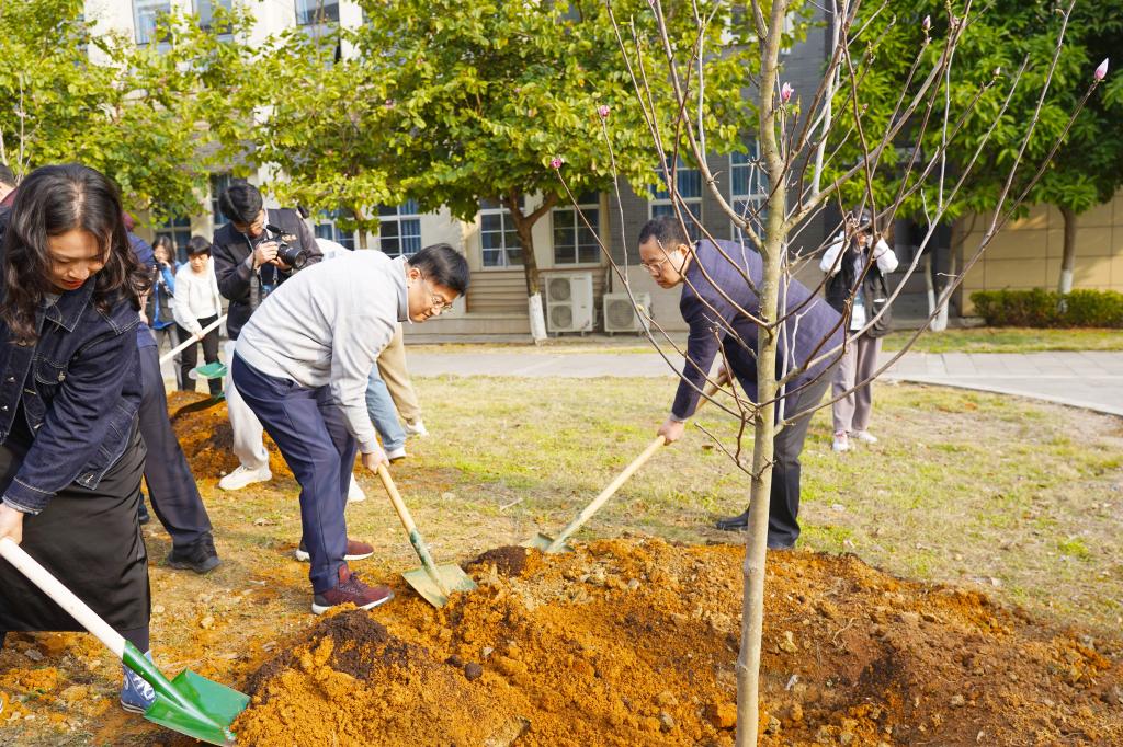 植树现场,大家热情高涨,扶树正苗、挥锹培土、踩土浇水,分工协作、配合默契,合力种下了精心挑选的紫玉兰苗和桃树苗。草坪上、湖畔边,一株株新绿正迎风挺立,展现出蓬勃生机。