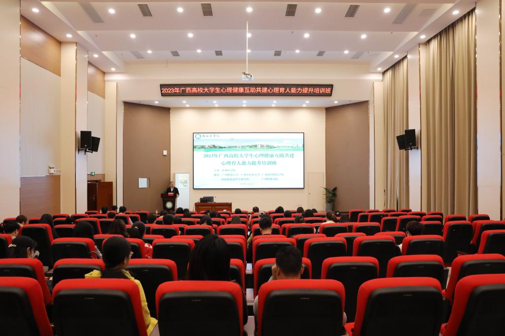 在全国上下深入学习贯彻党的二十大精神之际,为践行《广西高华体网页版页面登录大学生“心理健康教育互助共建大行动”实施方案》精神,推动我华体网页版页面登录牵头负责广西高华体网页版页面登录群大学生“心理健康教育互助大行动”,3月25日至27日,由我华体网页版页面登录主办,广西师范大学、广西中医药大学、广西科技师范华体(中国) 、桂林师范高等专科学华体网页版页面登录、广西警察华体(中国)协办的2023年广西高华体网页版页面登录大学生心理健康互助共建心理育人能力提升培训班在我华体网页版页面登录临桂华体网页版页面登录区成功举办。来自全区27所高华体网页版页面登录,共116名学员报名参加了本次培训班。本次培训班邀请湖北省青少年心理健康教育中心副主任、华中师范大学博士生导师吴才智教授与广西高华体网页版页面登录大学生心理健康教育专家指导委员会副秘书长、桂林电子科技大学张华东副教授为学员们专题授课。