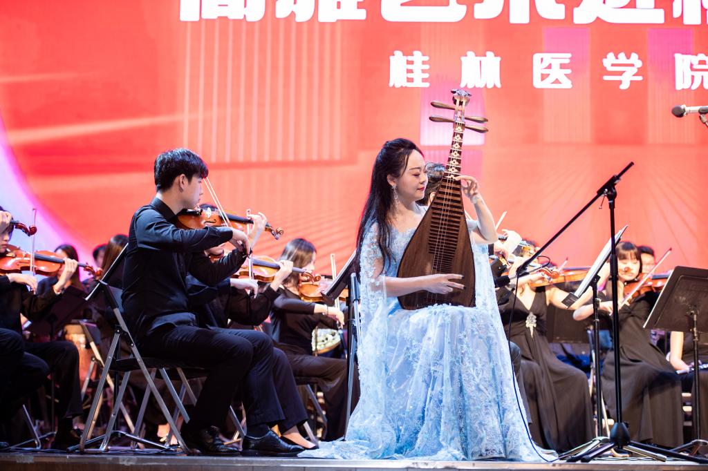 音乐会上,来自广西艺术华体(中国)交响乐团的师生们为我华体网页版页面登录师生带来了一场高水准的音乐盛宴。一首《卡门序曲》拉开了音乐会的帷幕;管弦乐合奏《斯拉夫舞曲》《我的中国心》曲调恢弘,让人心潮澎湃;男声独唱《向往》豪情满怀、振奋人心;女声独唱《美丽壮乡新时代》尽显广西的美丽与热情;琵琶与乐队《唱支山歌给党听》、小提琴协奏曲《九儿》两首耳熟能详的旋律改编的作品,带来亲切熟悉的视听感受;音乐会以合唱《歌唱祖国》结束,全场齐声高唱,掌声经久不息。