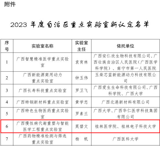 近日,广西壮族自治区科学技术厅下发了《自治区科技厅关于公布2023年度自治区重点实验室新认定名单的通知》(桂科基字〔2023〕33号),我华体网页版页面登录第二附属医院莫碧文教授牵头申报的“广西慢性病代谢重塑与智能医学工程重点实验室”获批认定建设,桂林电子科技大学为共建单位。