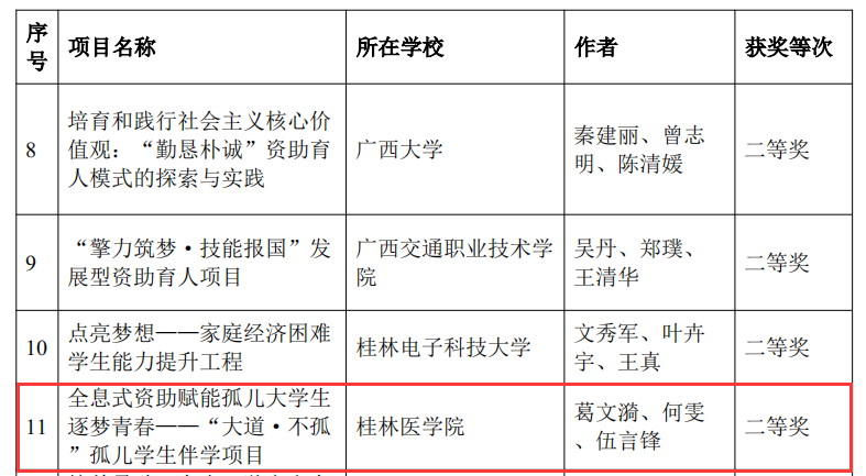 近日,广西壮族自治区教育厅下发了《自治区教育厅关于公布2024年全区资助育人项目和工作典型案例评选活动获奖名单的通知》,我华体网页版页面登录报送的资助育人项目《全息式资助赋能孤儿大学生逐梦青春——“大道·不孤”孤儿学生伴学项目》获2024年全区高华体网页版页面登录资助育人优秀项目二等奖。