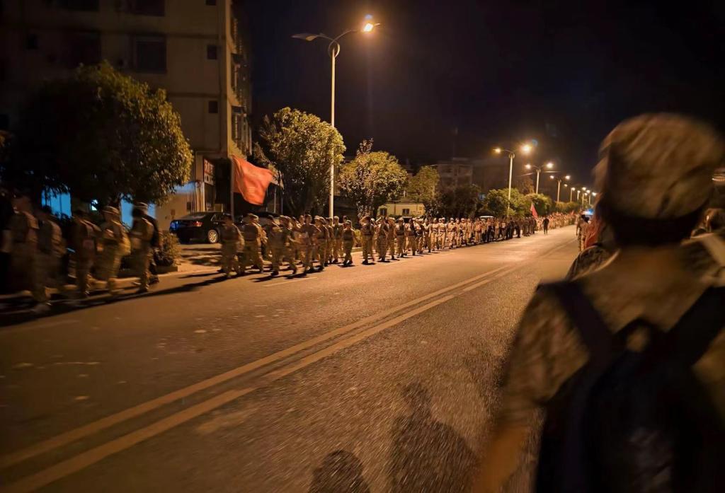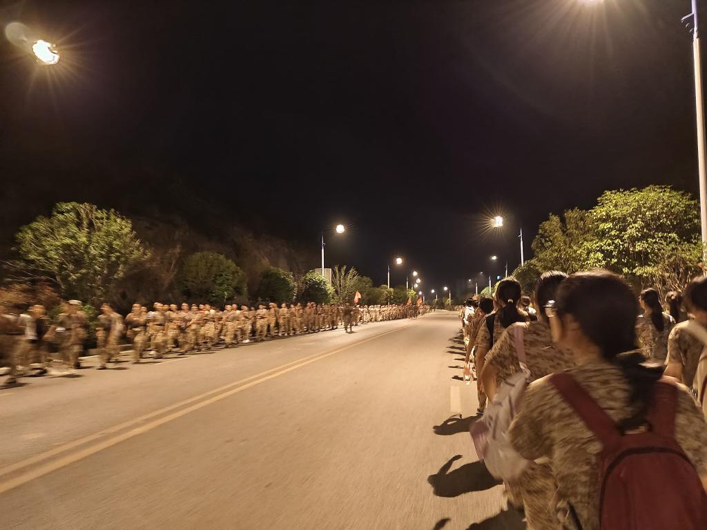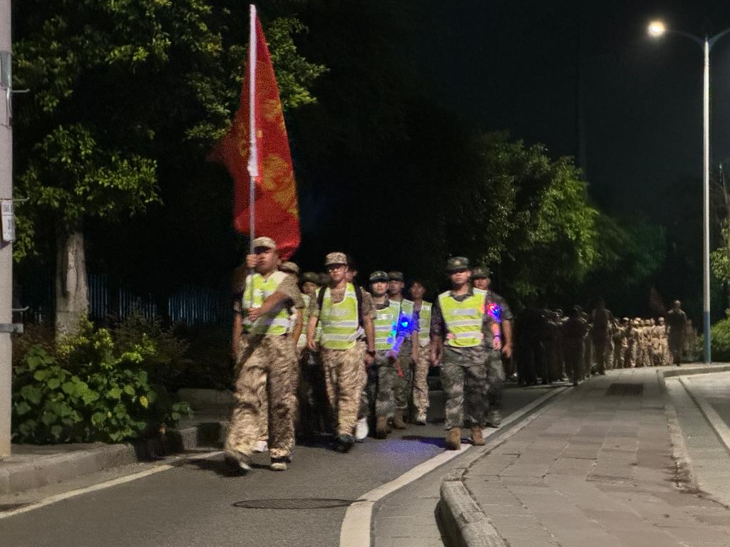 凌晨零时,随着紧急集合的哨声,2024级军训团迅速在学华体网页版页面登录南田径运动场集合。整队完毕后,2024级军训团按序列分别从东门、北门出华体网页版页面登录园,东路纵队沿致远路、人民路、西城大道、飞虎路从学华体网页版页面登录北门返回华体网页版页面登录区;西路纵队沿飞虎路、广福路、瑞宁路、致远路返回华体网页版页面登录区,全程行军约15公里,3100余名学生参加行军拉练,行军队伍分三路纵队行进,尖刀班行进在军训团最前面,开辟行军道路,军训团各连依次跟进。行军全程配备有救护车、安保车、交通车、警车等保障车并进行流动巡医等保障;途径各交通路口时,派出安全调整哨,切实保障军训全团安全。凌晨4时许,军训团全团安全、顺利返回临桂华体网页版页面登录区。