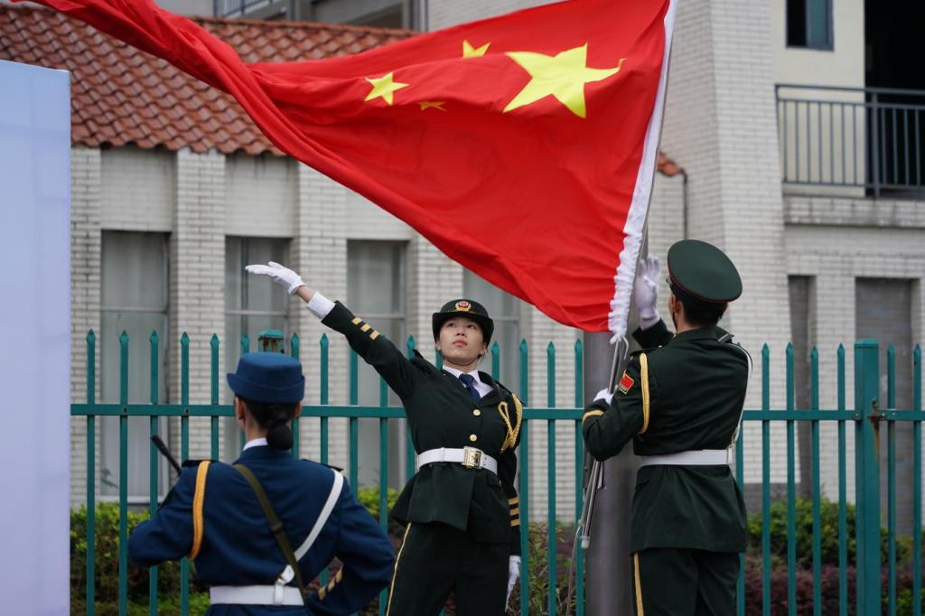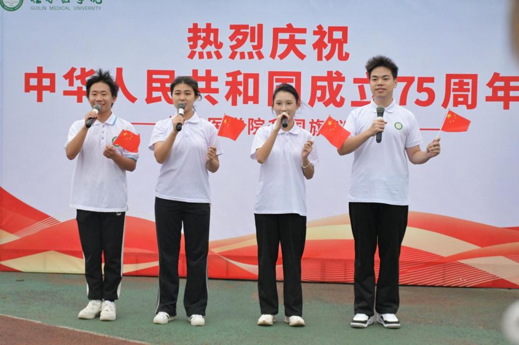 鲜艳的五星红旗在庄严的国歌声中冉冉升起,全体师生肃立,怀着崇高敬意向国旗行注目礼。五星红旗迎风飘扬,桂医青年在国旗下庄严宣誓:“我志愿献身医学,热爱祖国,忠于人民,救死扶伤,不辞艰辛,为人类身心健康奋斗终生。”随后,学生代表以“高擎理想的旗帜,燃烧信念的火炬”为主题进行了国旗下的演讲,用无数青春的榜样激励同学们以实现中华民族伟大复兴为己任,以更加坚定的决心意志和强烈的使命担当努力把青春华章写在祖国大地上。