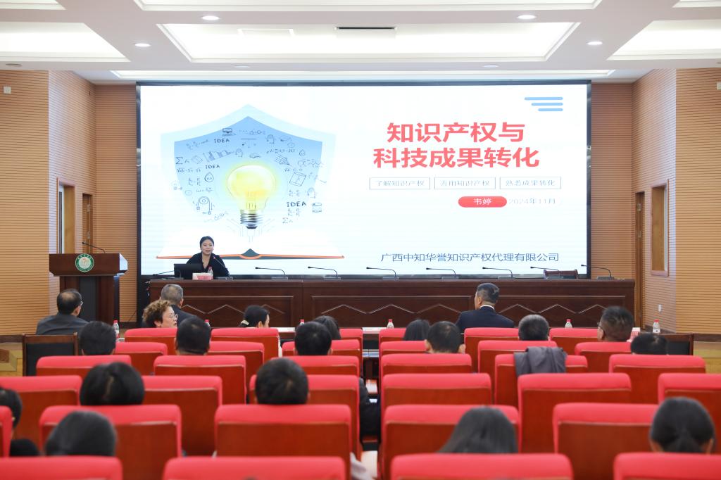 签约仪式结束后,广西知识产权协会副会长、广西中知华誉知识产权代理有限公司总经理韦婷开展题为《知识产权与科技成果转化》讲座,就知识产权典型案例、知识产权保护的重要性、专利申请流程、科技成果转化实例等方面进行讲解。
