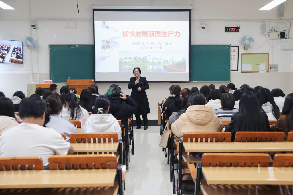 曾小云以“加快发展新质生产力”为题,从“什么是新质生产力;为什么要发展新质生产力;怎样发展新质生产力;发展新质生产力的青年担当:医学生如何融入时代浪潮”等四个方面,深刻阐释了新质生产力的科学内涵、发展新质生产力的重大意义、培育发展新质生产力的实践路径和医学生与新质生产力如何实现双向奔赴等重大理论和实践问题。