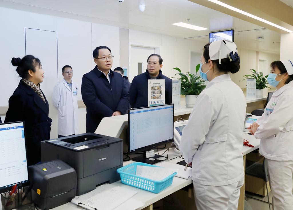 调研期间,马献力一行深入门诊、重症医学科、麻醉科手术室及消化内科病房等区域进行实地考察,向相关人员详细了解了门诊管理系统、重症医学科的救治设备设施、麻醉科手术室的标准化操作流程以及消化内科病房的环境等。他与医护人员亲切交谈,关切地询问了他们的工作状态和患者的反馈情况,对医护人员辛勤付出给予高度赞扬和深切关怀。在病房,他与患者面对面交流,关切地询问他们的病情和治疗效果,鼓励他们保持乐观心态,积极配合治疗,早日康复。