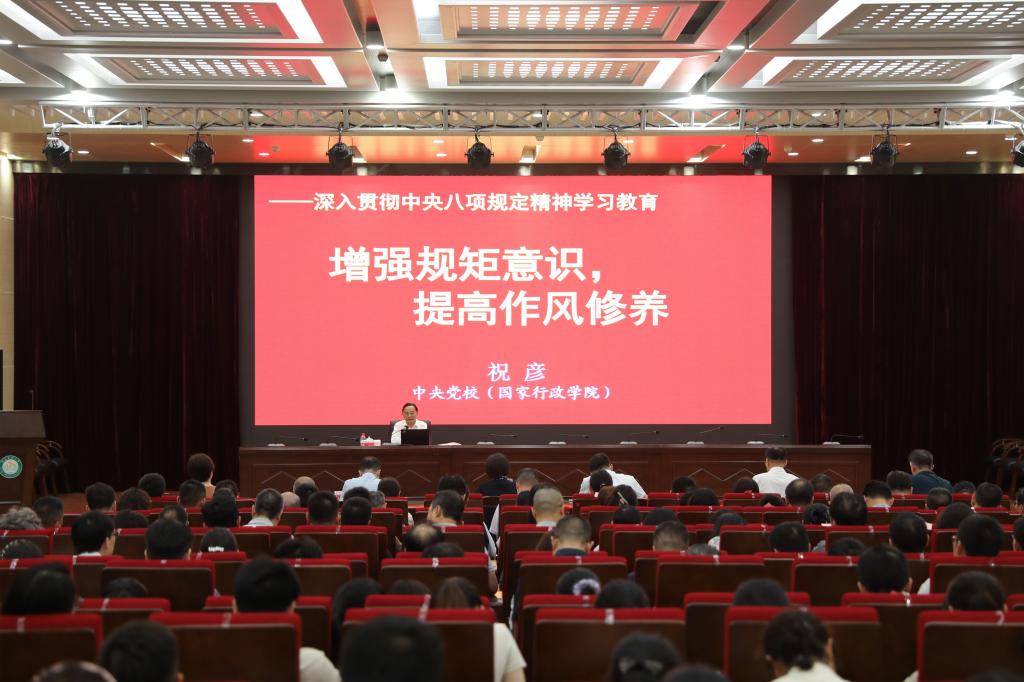 祝彦紧扣报告主题,以深入解析中共中央办公厅印发的《关于在全党开展深入贯彻中央八项规定精神学习教育的通知》精神开篇,理论联系实际,历史与现实相结合,运用大量的数据和案例,深入浅出地解读了习近平总书记关于加强党的作风建设的重要论述以及中央八项规定主要内容,系统阐述了“为什么要开展学习教育”,强调作风建设只有进行时,没有完成时,提出要持续深化学习教育,持之以恒落实中央八项规定精神,推动作风建设常态化、长效化。