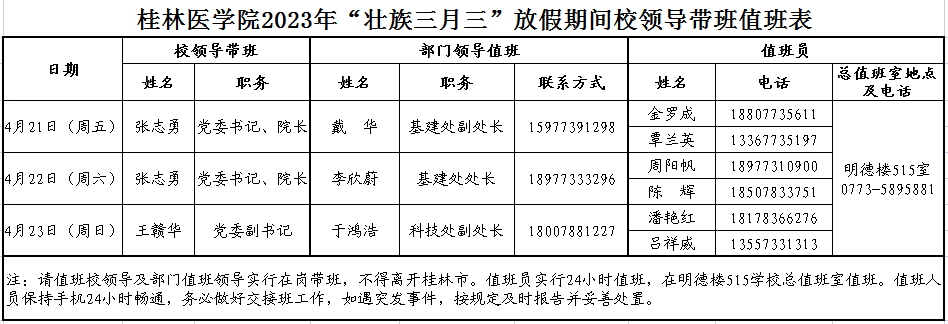 桂林医华体(中国)2023年“壮族三月三”放假期间华体网页版页面登录领导带班值班表