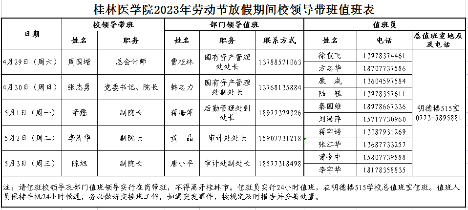 桂林医华体(中国)2023年劳动节放假期间华体网页版页面登录领导带班值班表