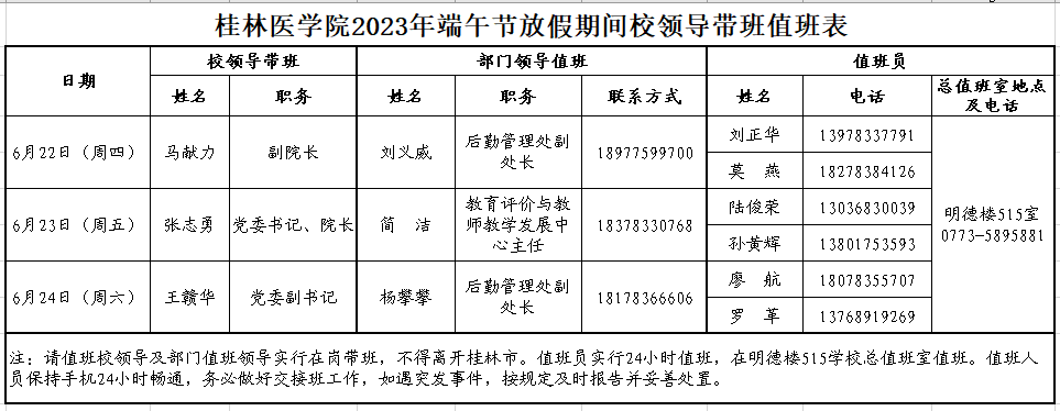 附件:桂林医华体(中国)2023年端午节放假期间华体网页版页面登录领导带班值班表