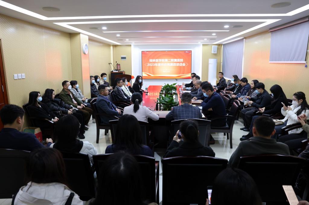 为贯彻落实二十届中央纪委二次全会和自治区纪委十二届三次全会精神,进一步推进清廉医院建设,规范医院医药产品购销行为,切实抓好医院在医疗器械、耗材物资采购、基建工程项目等方面的廉洁风险防控工作,3月24日上午,医院党委书记葛波,党委副书记、纪委书记彭鹏组织开展桂林医华体(中国)第二附属医院供应商集体廉洁谈话,医院纪委监察室、招标管理科、设备科、药学部、基建科、后勤管理部等部门负责人及供应商代表共50余人参会。会议由彭鹏主持。
