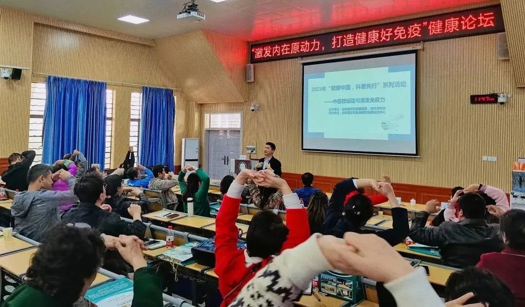 附属医院健康管理(体检)中心向桢主任从拍手操、椅子操、经络提升运动、颈椎操等微运动教大家通过气道养生、经络养生、泡脚、艾灸等方式激发免疫力。大家在现场纷纷行动起来,气氛活跃。