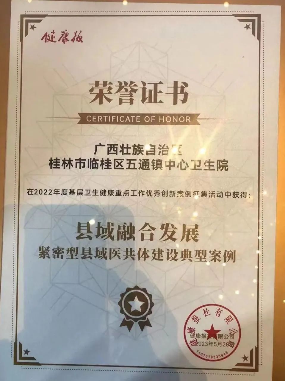 近日,临桂区五通镇中心卫生院获得《县域融合发展紧密型县域医共体建设典型案例》奖项,这标志着五通镇中心卫生院在基层卫生健康管理领域取得了一定成就。