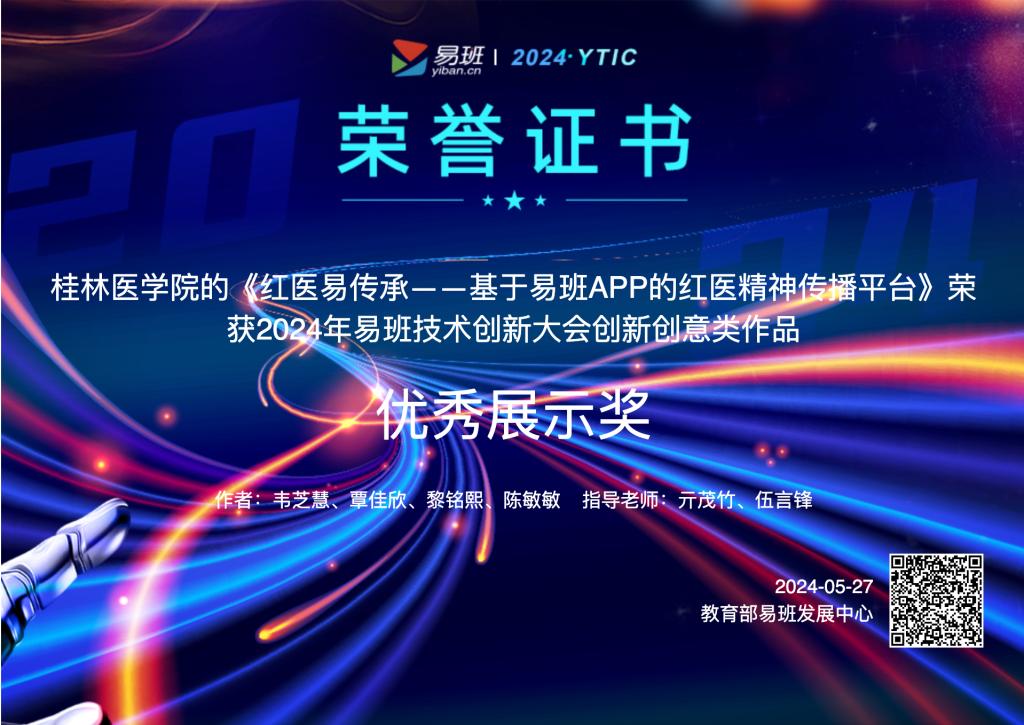 5月24日—27日,由教育部易班发展中心主办的“2024年易班技术创新大会”在海南黎安国际教育创新试验区举行。本届大会共有100余所高华体网页版页面登录、300余名师生现场参会,共有94件作品参赛。我华体网页版页面登录参赛作品《红医易传承--基于易班APP的红医精神传播平台》(作者:韦芝慧、覃佳欣、黎铭熙、陈敏敏 指导老师:亓茂竹、伍言锋)荣获创新创意类作品优秀展示奖。