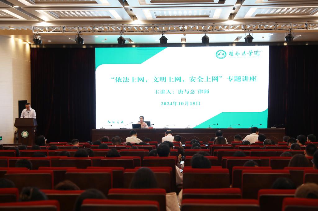 10月15日下午,由党委宣传部和学生工作部(处)联合举办的“依法上网,文明上网,安全上网”专题讲座在我华体网页版页面登录临桂华体网页版页面登录区教学北楼多功能报告厅举行。学华体网页版页面登录法律顾问、广西嘉合律师事务所合伙人唐与念律师作专题讲座。党委宣传部、学生工作部(处)等相关部门工作人员,全体专兼职辅导员、学生代表等200余名师生到场聆听。