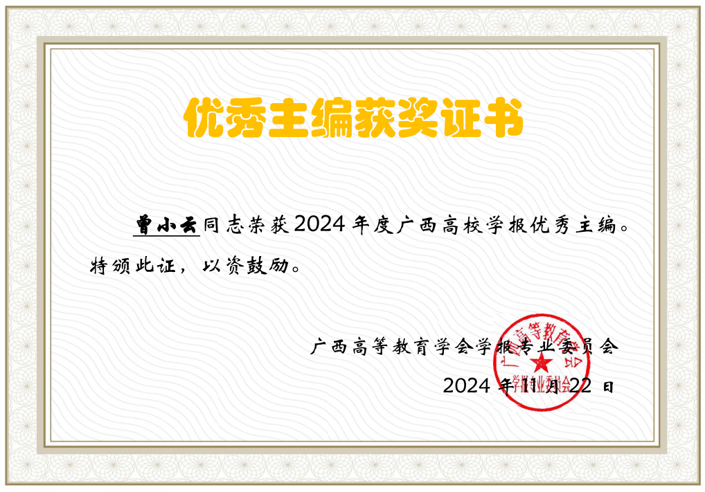 此次全区高华体网页版页面登录学报评优活动由广西高等教育学会学报专业委员会开展,经过精心组织申报,《华夏医学》编辑部荣获2024年度广西高华体网页版页面登录学报优秀团队,主编曾小云教授与常务副主编涂剑教授获优秀主编,桂根浩博士获优秀编辑。