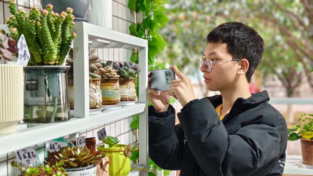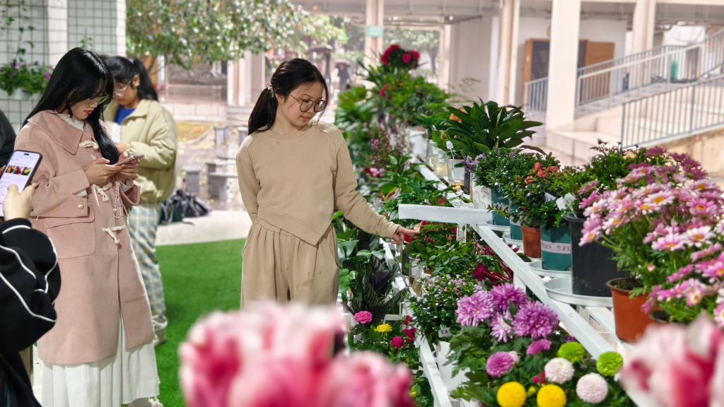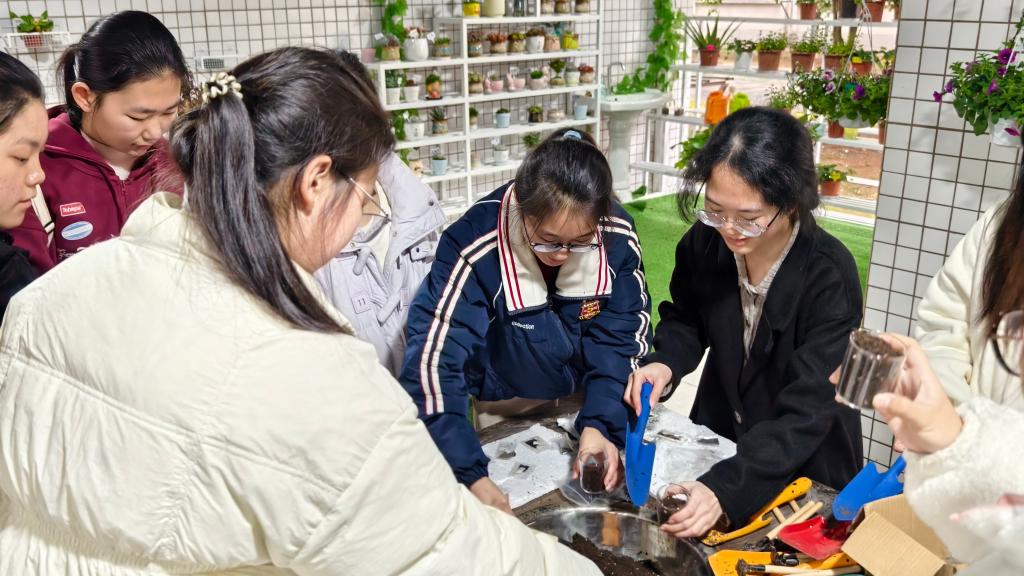 在“春日打卡环游”活动中,参与者深入园艺区,倾心感受“生命观察站、色彩情绪墙、舒缓减压区等五个主题能量站,他们纷纷打卡留念。在“春日心灵播种”活动中,学生通过培育种子盲盒建立生命对话,在记录绿植生长的同时完成自我觉察,撰写播种日记。在“心灵画布—春日涂鸦”活动中,以10米长卷为情绪表达载体,抽枝的新芽与绽放的鲜花构成集体心理图谱,通过对色彩的分析,帮助参与者释放压力。“春日插花会”活动给了参与者更大的想象、创作空间。学生根据喜好、植物属性挑选花材,在修枝剪叶中学习情绪管理,理解生命的不同力量。活动现场氛围热烈,大家都沉浸其中,享受快乐过程。