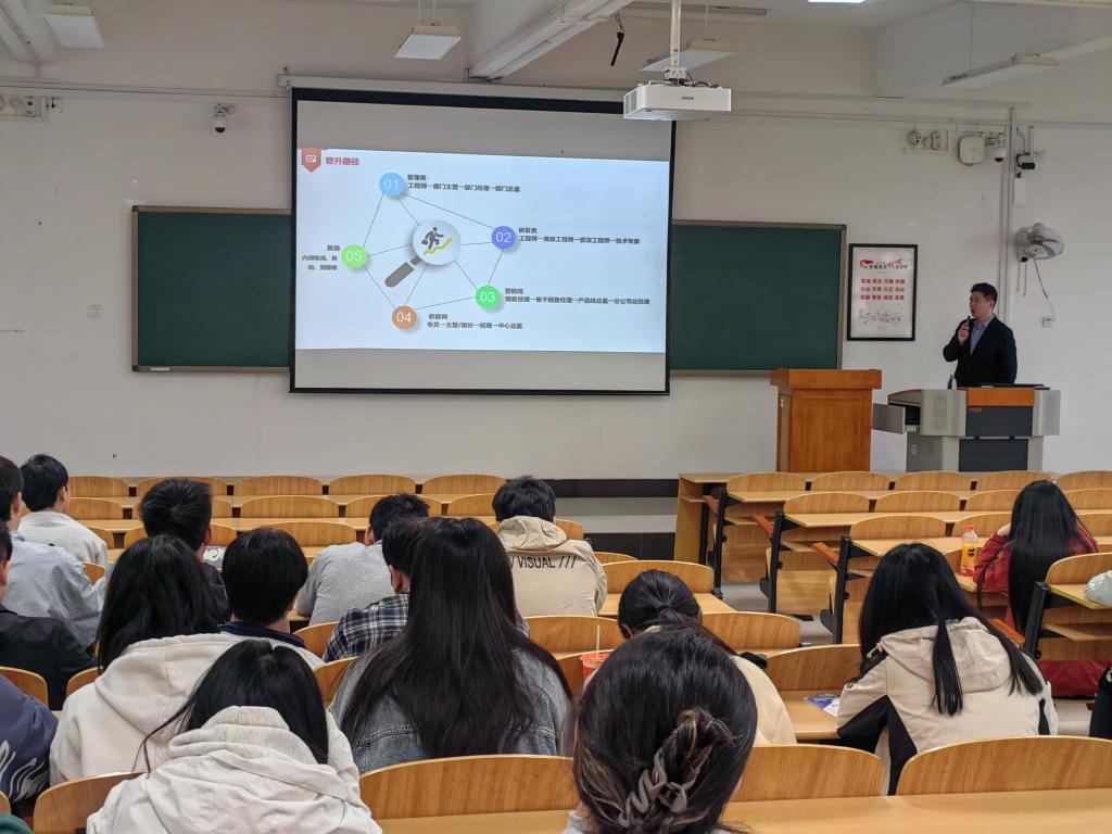 宣讲会现场,公司人事部门经理通过PPT展示全面介绍公司概况。同学们详细了解了公司的基本情况、招聘岗位、福利待遇等信息并住宿问题、晋升渠道、工作区域、薪资组成等相关问题积极提问。企业相关负责人进行了耐心解答。宣讲会结束后,同学们通过现场和线上的方式投递简历。