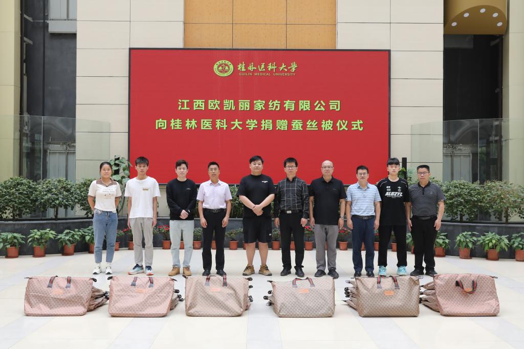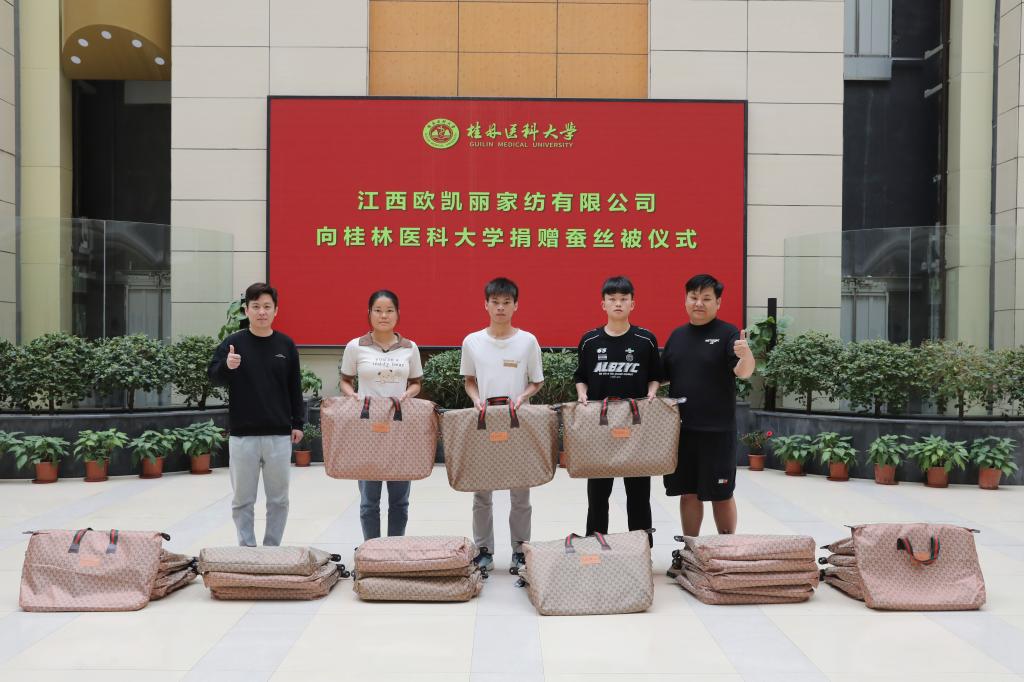4月17日,一场洋溢着温暖与爱心的捐赠仪式在桂林医科大学临桂华体网页版页面登录区举行。江西欧凯丽家纺有限公司向桂林医科大学捐赠100床蚕丝被,为广大学子送来暖心关怀。江西欧凯丽家纺公司桂林分公司总经理潘俊、副总经理雷琪,学华体网页版页面登录教育发展基金会、华体网页版页面登录友办、学生工作处(部)、乡村振兴办、工会等部门负责人及在华体网页版页面登录生代表共同参加此次活动。