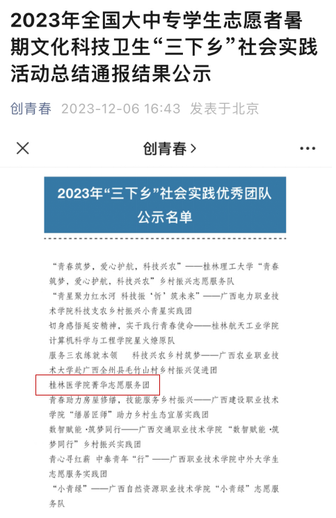 2023年,临桂临床医华体(中国)菁华志愿服务团获各级表彰或奖励,其中国家级1项、自治区级2项,如下:团中央青年发展部发布《2023年全国大中专学生志愿者暑期文化科技卫生“三下乡”社会实践活动总结通报结果公示》,菁华志愿服务团被评为2023年全国“三下乡”社会实践优秀团队;共青团广西区委发布《2023年广西大中专学生志愿者暑期文化科技卫生“三下乡”社会实践活动的通报》,菁华志愿服务团获评2023年广西“三下乡”社会实践优秀团队;自治区党委宣传部、自治区文明办、自治区教育厅、共青团广西区委、广西学联发布《关于公布2023年广西大中专学生志愿者暑期文化科技卫生“三下乡”社会实践活动重点团队名单的通知》,菁华志愿服务团获评2023年广西大中专学生志愿者暑期文化科技卫生“三下乡”社会实践活动自治区重点团队。