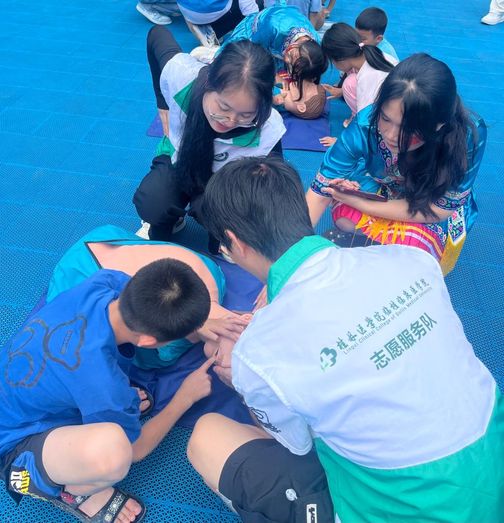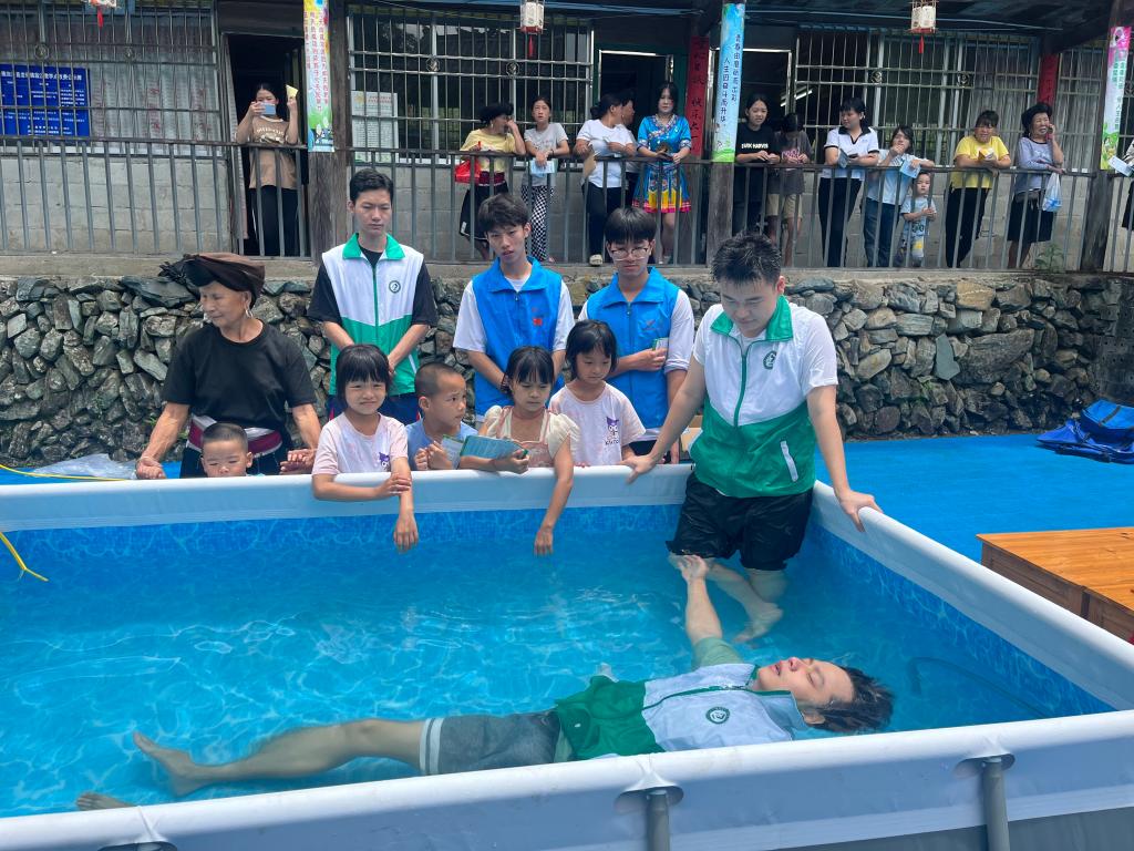 急救科普组将“模拟池塘”搬到了江柳村翁江小学的操场上,团队成员跟随主持人的解说,为群众模拟溺水后可能发生的情况,以及如何用不同方法自救和救人,以直观生动的方式普及防溺水知识。同时,团队成员配合急诊医学科医生开展急救知识普及活动,通过指导群众学习急救技能的基础理论知识、操作技术要点及注意事项,以及现场指导心肺复苏急救实操演练等方式,增强群众的应急救护意识。