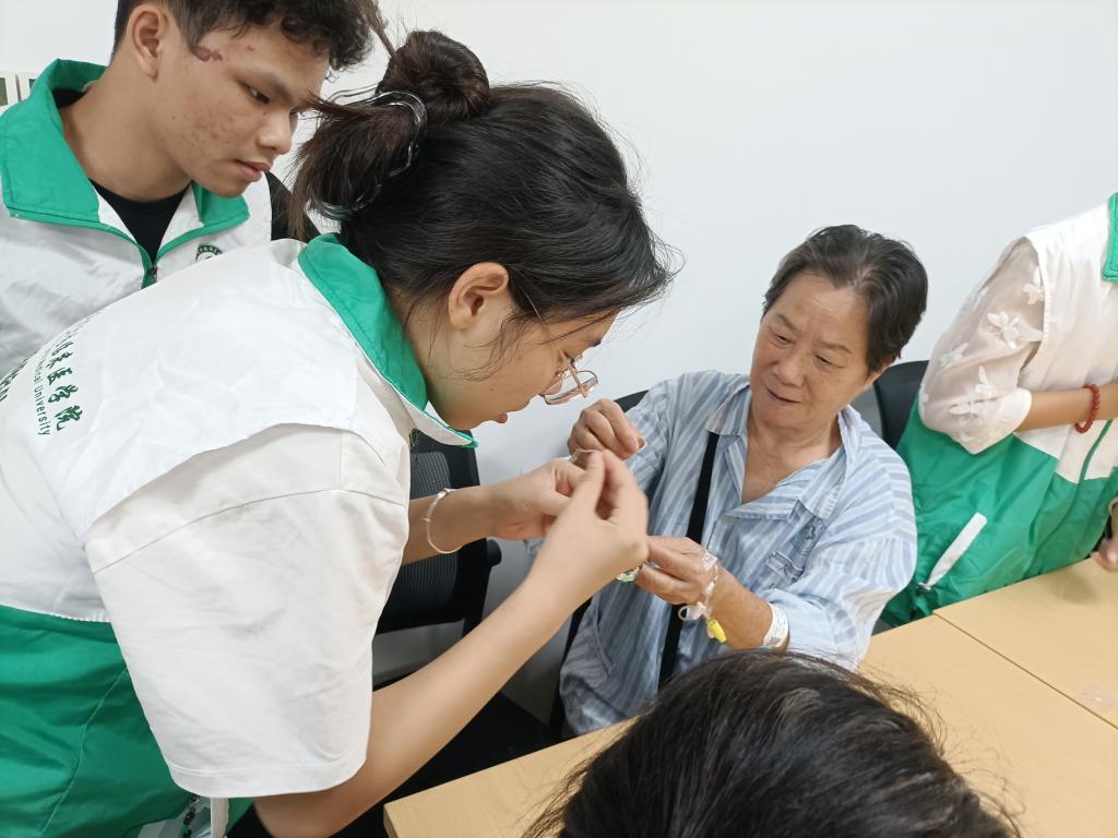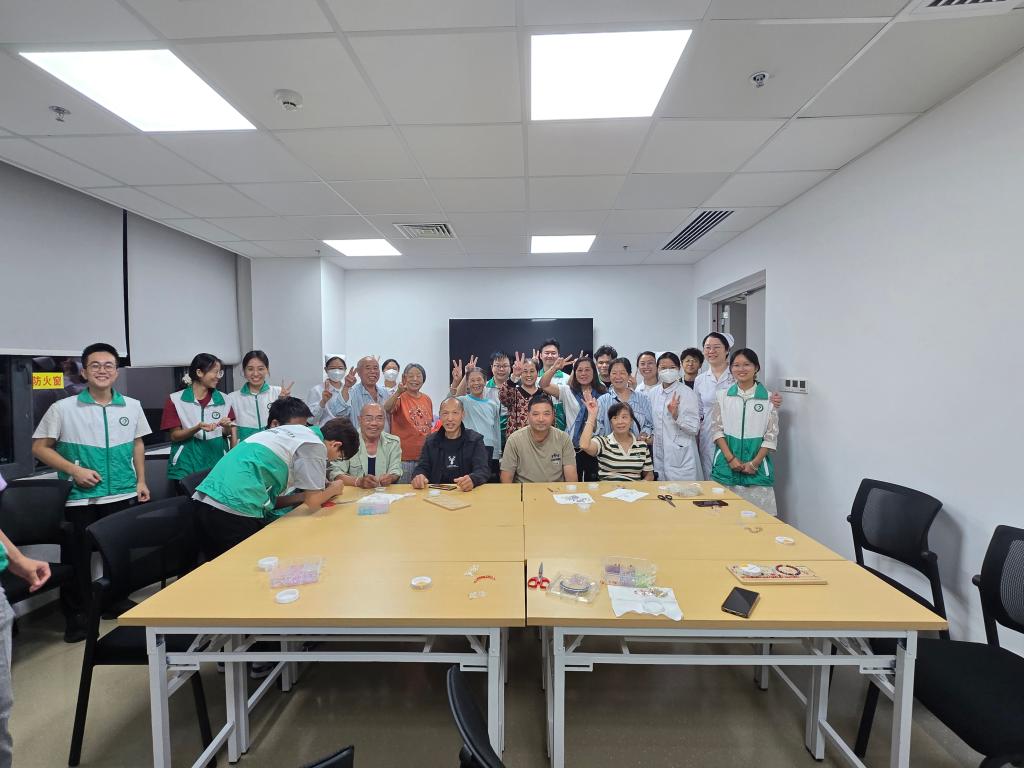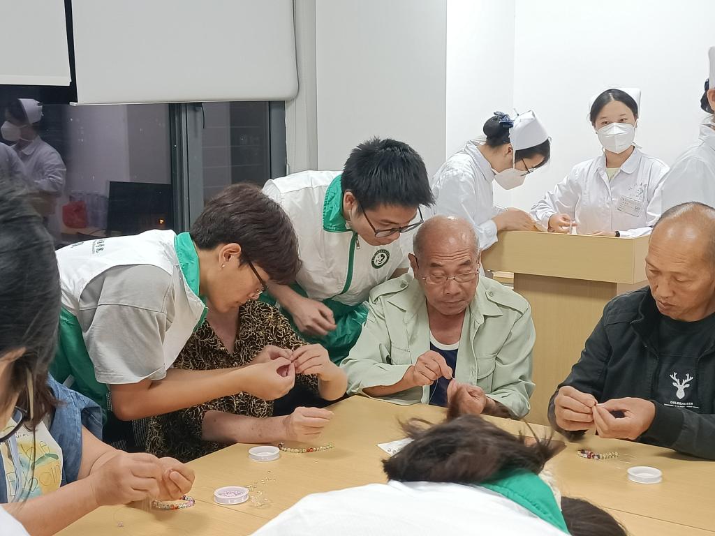 医护人员和学生志愿者为老人提供精美的珠子、绳子,协助老人制作手链。面对视力较模糊和手不稳的老人,志愿者一步步引导老人进行制作,帮助老人训练手脑协调,放松心情。活动结束后,老人们纷纷点赞,表示此次活动不仅让他们感受到了关爱和温暖,也见证了临桂临床学子的风采和社会责任感。随后,老人与志愿者分享生活的点滴,对话中充满真挚的情感。
